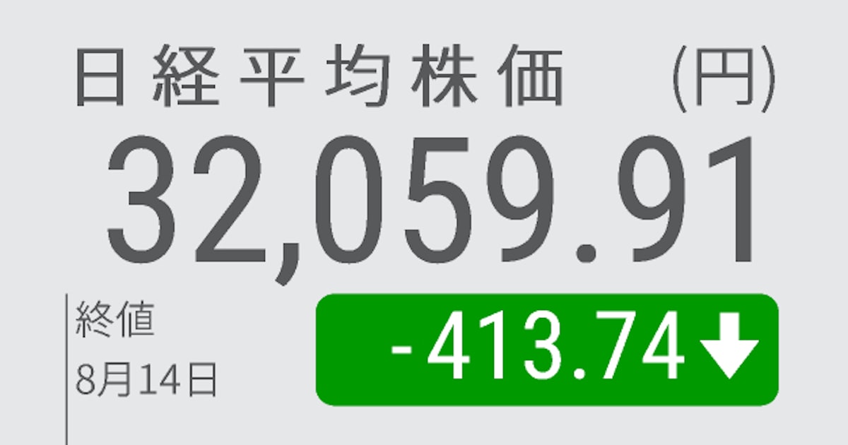 14日の東京株式市場で日経平均株価は反落し、前営業日比413円74銭(1.27%)安の3万2059円91銭で終えた。下げ幅は一時440円を超え、心理的な節目の3万2000円に迫った。米金利の上昇を背景に国内長期金利の指標となる新発10年物国債利回りが上昇し、持ち高調整の売りが広がった。中国景気の先行き不安も相場の重荷となった。