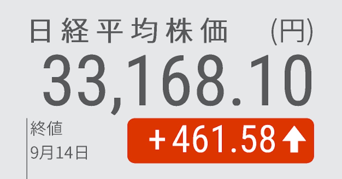 14日の東京株式市場で日経平均株価は反発し、前日比461円58銭(1.41%)高の3万3168円10銭で終えた。前日の米ハイテク株高を受けて運用リスクをとりやすくなった投資家の買いが東京市場で優勢だった。午後に入ると20年債入札を波乱なく通過したことによる買い安心感や早期の衆院解散・総選挙観測を背景に、海外勢の先物買いが膨らんで日経平均の上げ幅は一時500円を超えた。