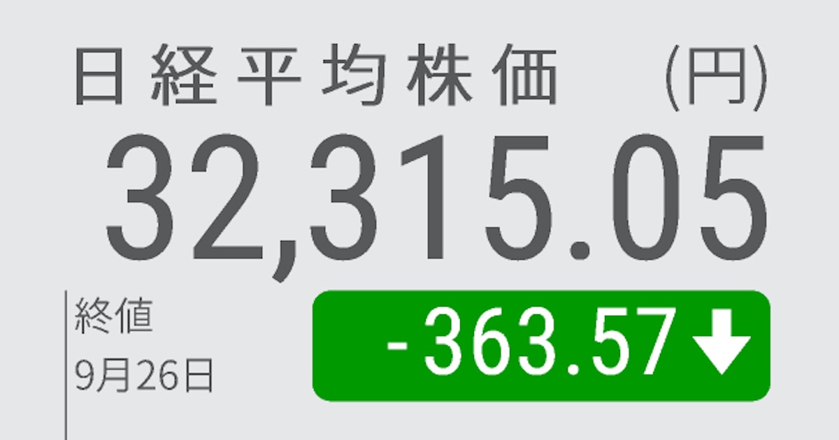 26日の東京株式市場で日経平均株価は反落し、前日比363円57銭(1.11%)安の3万2315円05銭で終えた。米連邦準備理事会(FRB)の金融引き締め長期化観測を背景に米長期金利が上昇し、高PER(株価収益率)銘柄が多いグロース(成長)株の重荷となった。値がさの半導体関連銘柄が売られ、日経平均を押し下げた。